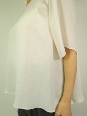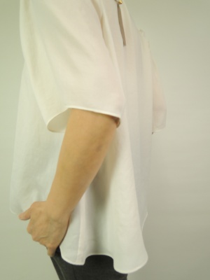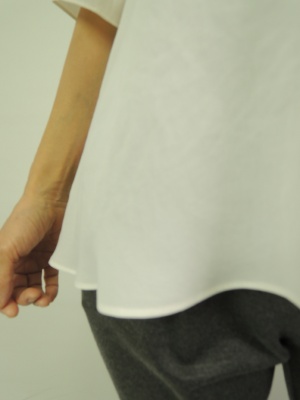 裾はアーチ型でやや広がりのあるデザイン、肩のフリルは内側に向いて付いてるので肩幅は広く見えない