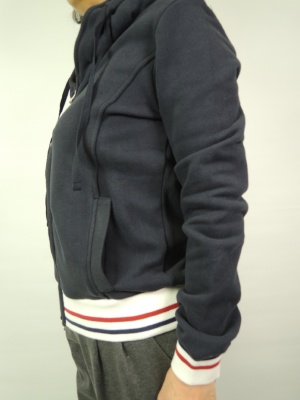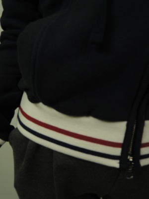 裏毛、裾と袖口はトリコロールカラーでポイントを付けてます、衿の中にパーカを収納