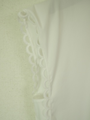 フレンチ袖、ふちにカットワークレース、 脇の開きを三角生地でふさいであ¥ます、後ろに着脱用ファスナー