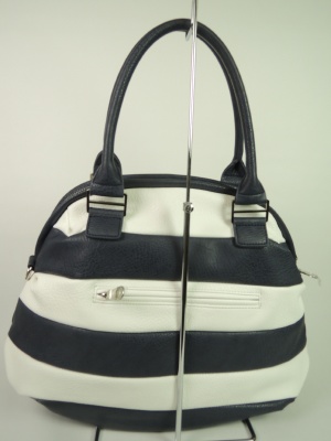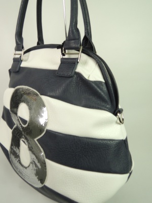合皮、ネイビー×白、スパンコールはシルバー、中の布はブルー地に星マーク 、ショルダーベルトはネイビーが附属 こちらは一番大きいサイズ