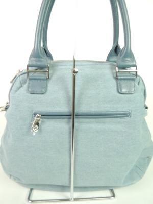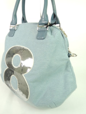 薄い色のデニム地 スパンコールはシルバー、中は青い色の地にドット柄)ショルダーベルトは表面と同じようなブルー、今回は天ファスナーの前後にポケットがあります こちらは大