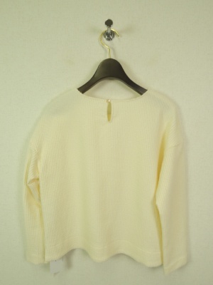 凹凸のある生地が特徴、プルオーバー前上がりデザイン、裾脇下はラウンドカット