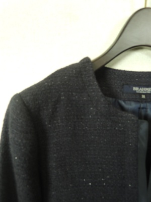 ラメツイードのジャケット、裏地有、前立て、ポケット、袖口に別生地(たまぶち) 袖は折り返し可能(スリット入り)