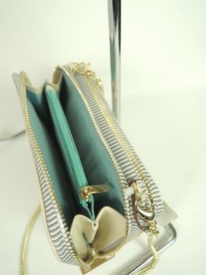 お財布タイプのバッグ、チェーンは取り外し出来ます、ファスナーで一つは財布に小銭入れも中央にあります、もう片方は カード入れとスマホなど収納可能です (スマホは機種によって使用できない場合もございます)