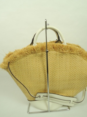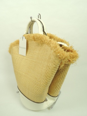 ラフィアを使った素材 内側にファスナー付きのポケット(間仕切りになってます)持ち手(ベルト)取り外し可能