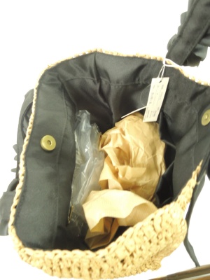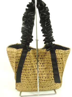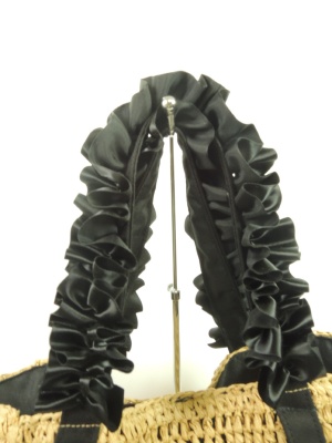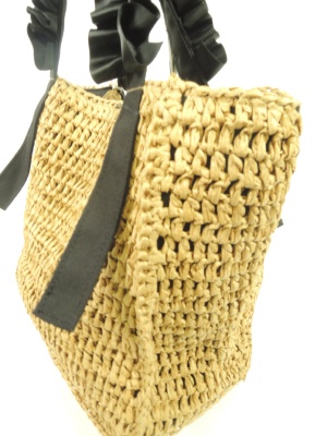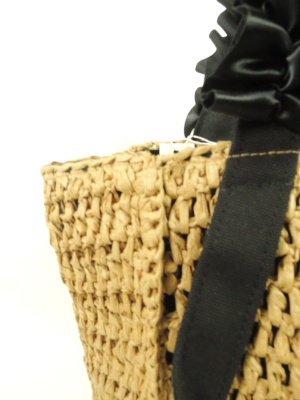 天然素材で編んだ表に内側は袋状に別布を縫い付けてある、ファスナーポケットと普通のポケットがついてマグネットボタンで閉じれます、リボンの持ち手 色はリボンで区別(天然素材のところは同じ色)