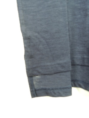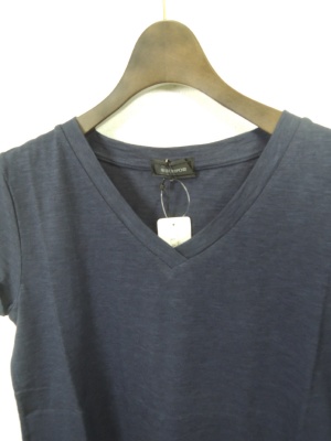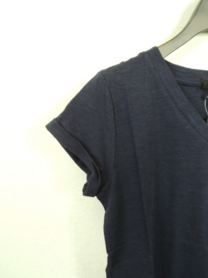 Vネックカットソー、袖口が一つおりデザイン、前上がりで脇スリット、手洗い可能