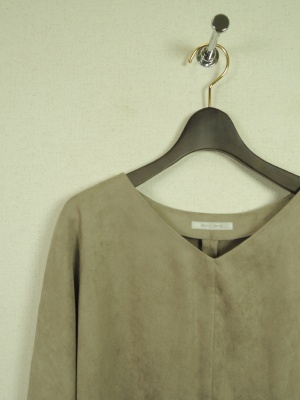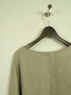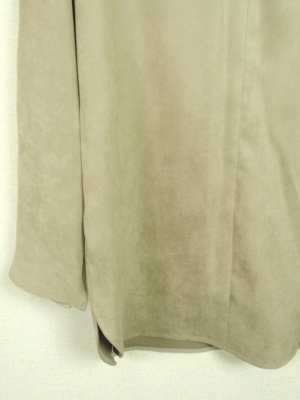 V字開きのフェイクスエード、袖口にスリットあり、横脇もスリットあり、裾ラインがラウンドしてます、裏なし