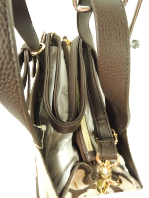柄違い、真ん中の仕切り部分がファスナーになっている、ショルダーは取り外し可能