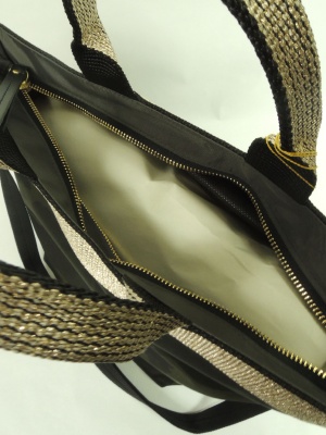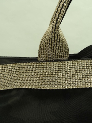 持ち手とバッグの口部分が金糸テープ、天ファスナー、持ち手取り外し可能、迷彩柄
