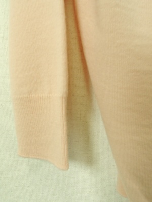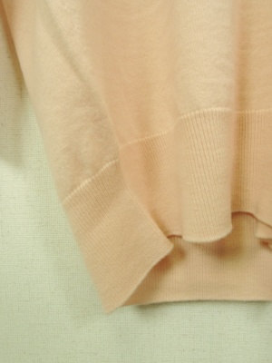 着丈が長めのニット、深めのV開き、前身ごろ短い