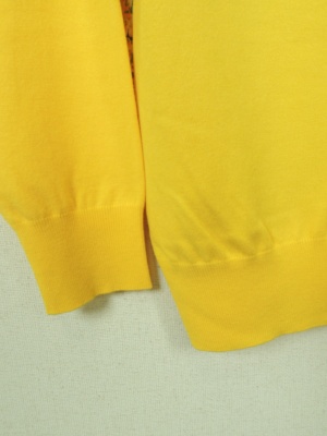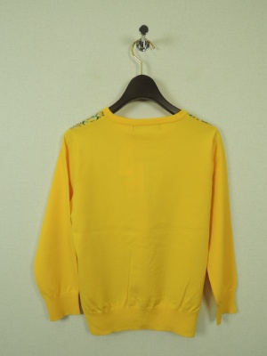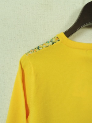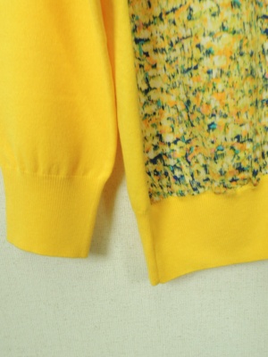 前身ごろが異素材のプリント柄、袖と後ろは無地のニット