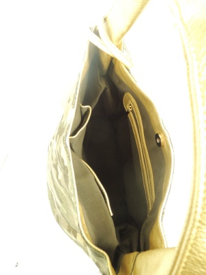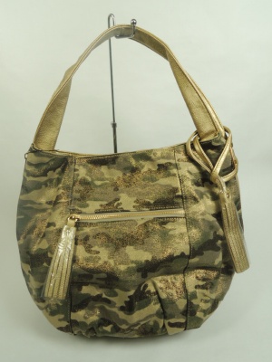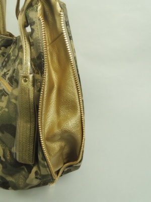 ラメ入り迷彩柄 持ち手とマチ部分(ファスナーで開閉できる)はゴールドの無地 外ポケット(ファスナー)飾りタッセル  マグネットボタンで開閉