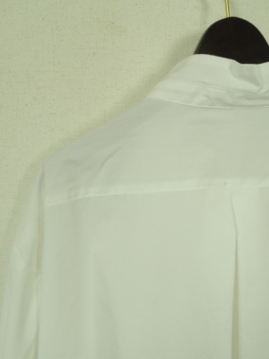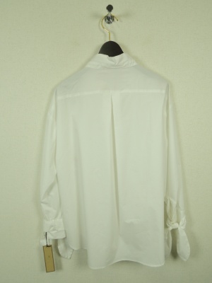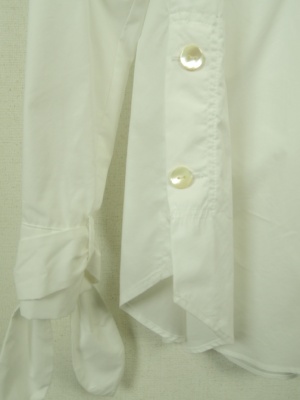 スキッパー襟、両脇にボタンのスリット、袖はカフスで共布のリボン結び、取り外し可能