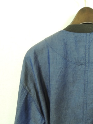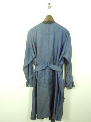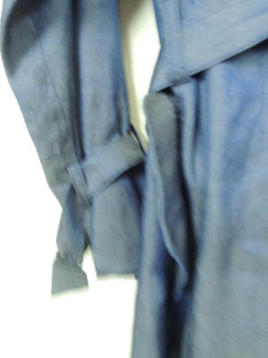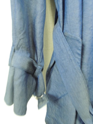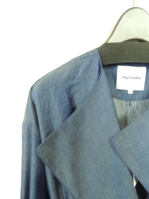 ダンガリー素材の襟なしトレンチコート ボタンなしでウエストサッシュベルト付き 袖口も飾りベルト 裏地なし