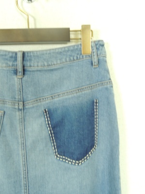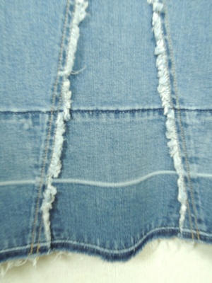 マキシのデニムスカート、やや裾広がり、デザインは前にフリンジデザイン、裾と後ろポケットの色が濃いめです