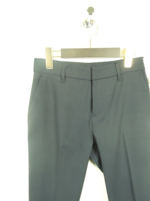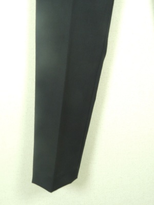 センターライン入りのややテーパード気味のストレートタイプ、くるぶし丈、脇ポケット、裏なし