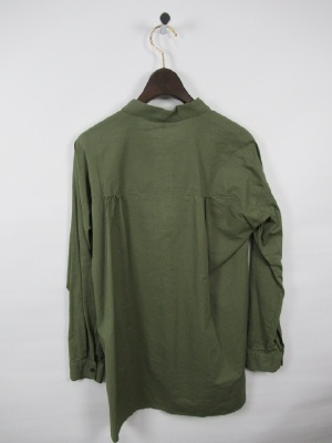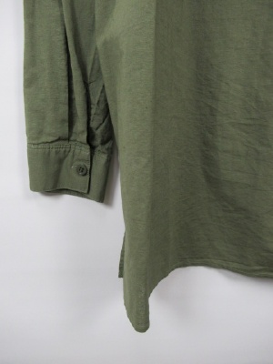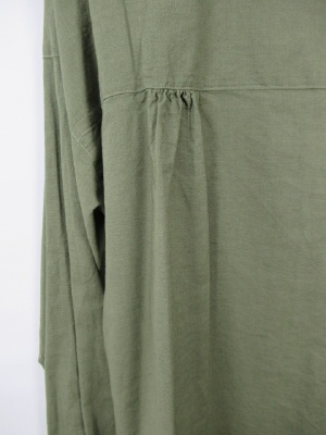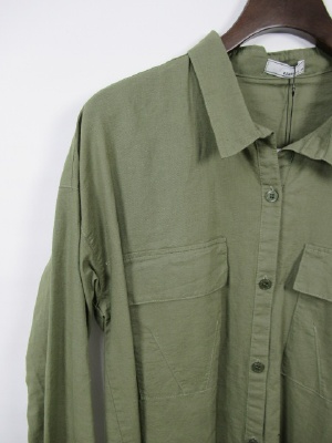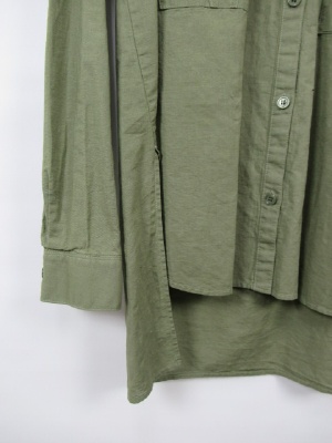 ビッグシルエットシャツ、胸元の大きなポケットが印象的で、前上がりのデザイン、後ろにギャザータック有り、手洗い可能