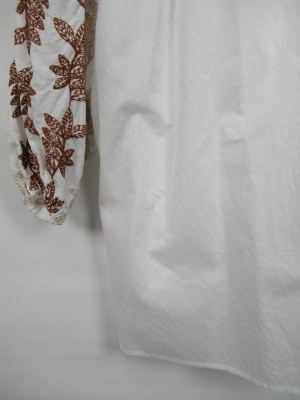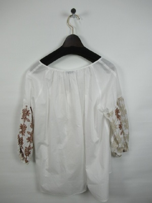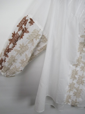 フォークロア調の刺繍ブラウス、ラグラン袖、首周りドロストタイプ、紐の先がフリンジ、手洗い可能
