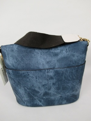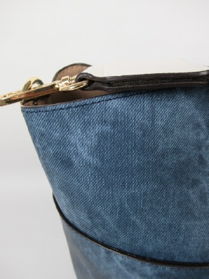 デニム地のような合皮の生地、外ポケットあり、中に花柄のインバッグ、白の(無地)ショルダーベルト付き、