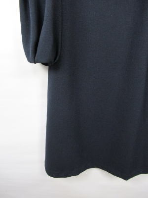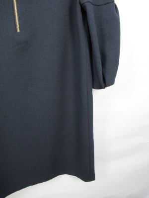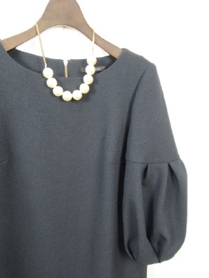 サックワンピース、裏地あり、袖は途中切り替えのボリューム袖、後ろファスナー(ゴールド)、ネックレス付き
