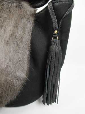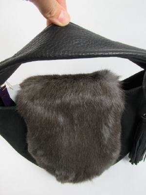 マグネットボタン、中のしきりにファスナーがあり、口が3つにわかれます、ファーを上からかぶせるタイプ
