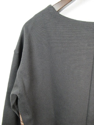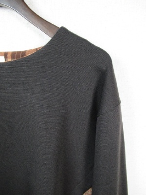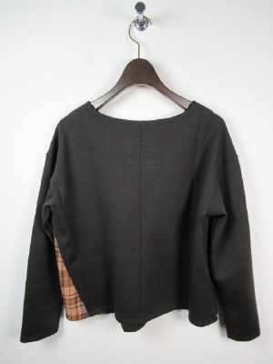 ややドロップショルダーで左部分にチェックの異素材、左脇部分から切り替えになっていて後ろ身ごろも少し別布が見えます