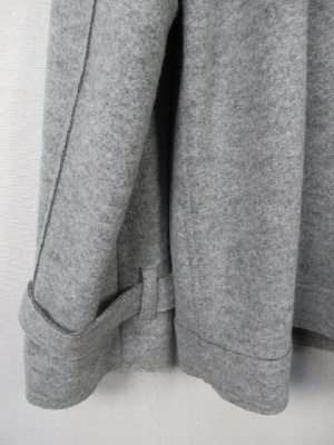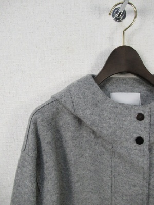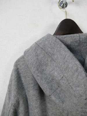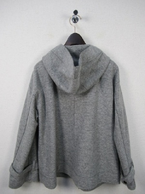 圧縮ウールのフード襟ショートコート、裾広がりのゆったりめ、袖はドロップショルダーで袖筒も広く作ってます、圧縮ウールの切りっぱなしデザイン、前ファスナー