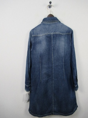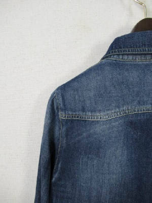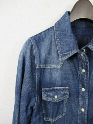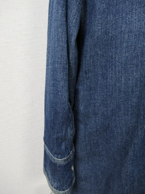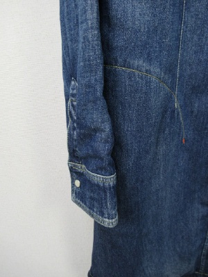 身ごろ部分にダウン、お袖は裏地のみ、前開き(ボタン)、羽織としても活用できる、裾はラウンドしてます、ステッチが黄色