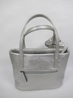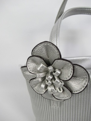 前は波打ったデザイン後ろは凹凸無し 花のモチーフは取り外し可能 天ファスナー 片方は内ポケット ペイズリー柄 外にファスナーポケット