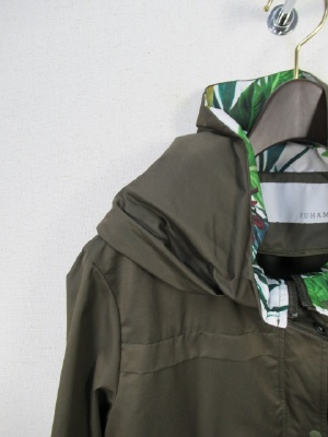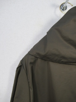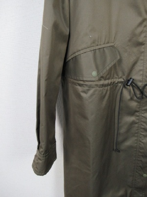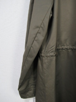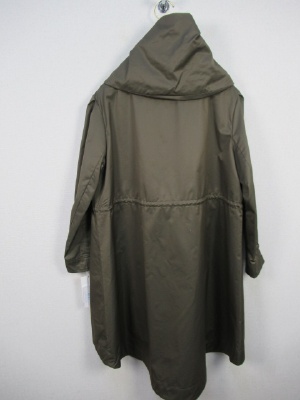 撥水加工のスプリングコート、前後差あり(後ろはラウンド)、ウェスト部分ゴムで調整できます、前ファスナーでボタン