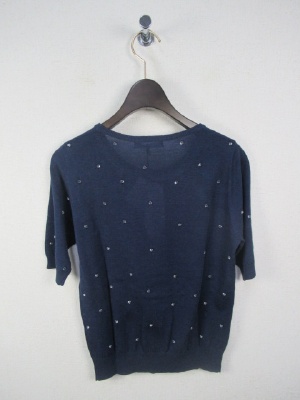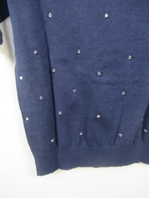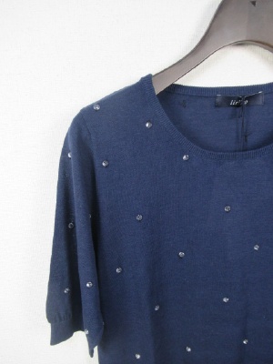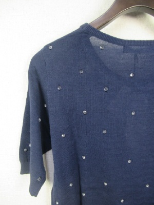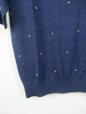クリスタルなボタンを糸でトッピング クルーネックの5分袖 手洗い可能 そろいのカーデあり