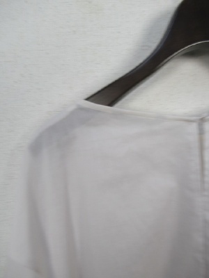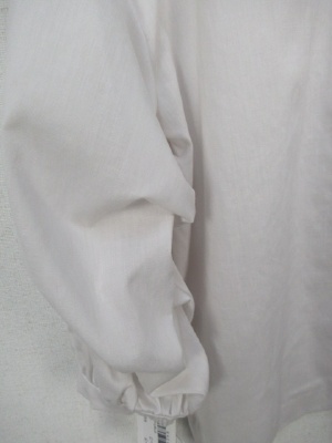 96824と同じデザインの生地置き換え(麻混になって一段と夏まで使える生地になりました)。ドロップショルダー 袖口に近いところに タック寄せでつまんでボリュームを出す カフスは半分ゴムが入ってます。 袖の内側に2箇所ボタンがありそれをはずすとタックが外れて普通 の袖になります やや前上がり 後ろにボタン一つ