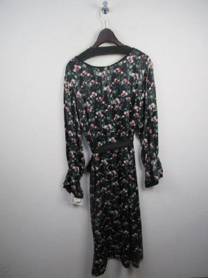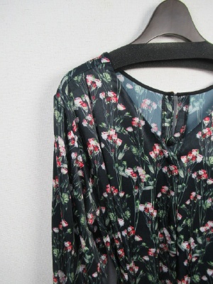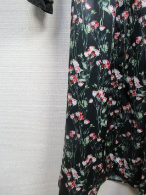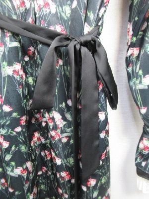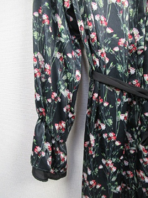 花柄 光沢ある生地のシャツワンピース マキシ丈 袖は口の方にギャザーゴムでボリューム(無地の布を重ねる)黒のリボンベルト付き 前開き 比翼ポケット