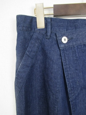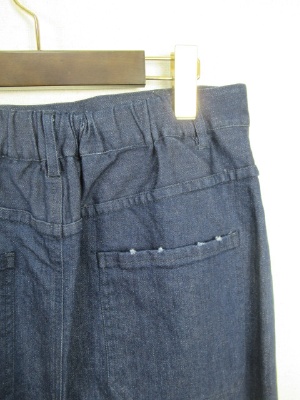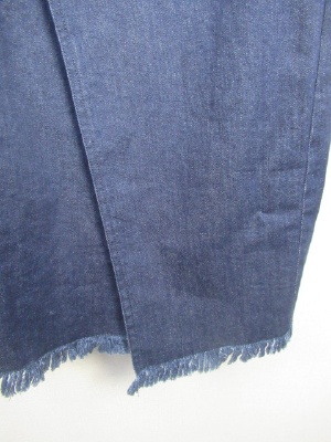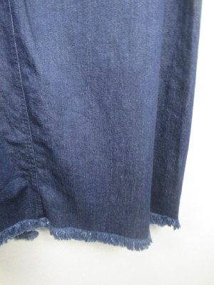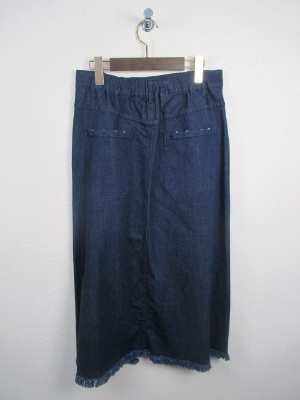 ロングタイプのデニムスカート ラップ風のデザイン 裾に向かって細くならずややあラインでざいん裾はフリンジ フロントホック ウエスト後ろゴム