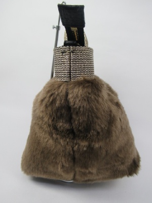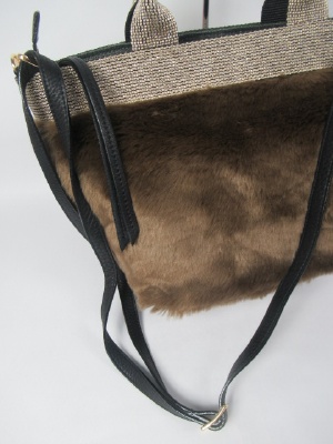 フェイクファー、持ち手あり(取り外し可能)マチは深め、シルバーゴールドのリボンテープ、天ファスナー