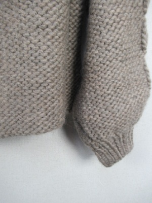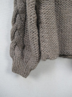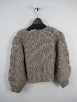 短めのローゲージニットカーディガン、袖はボリューム、袖山は大きなケーブル編み、ピンブローチ付き
