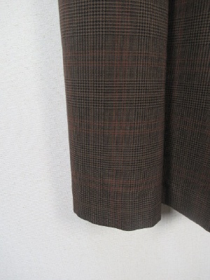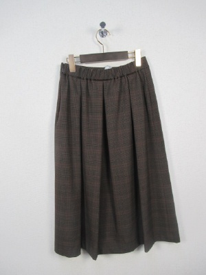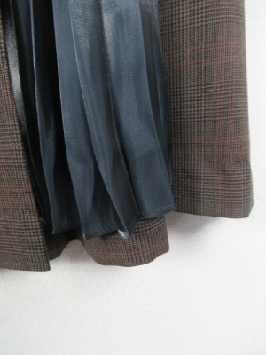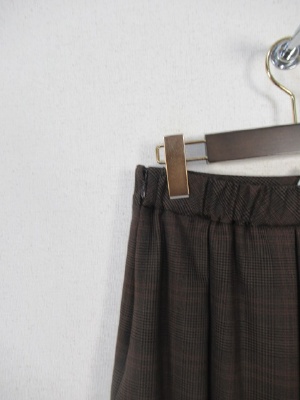 茶系のグレンチェック柄左片方にプリーツの異素材(チャコールグレーのサテン地やや光沢あり)を挟むデザイン2か所ベルト 裏地あり 脇ファスナー ウエスト後ろゴムあり