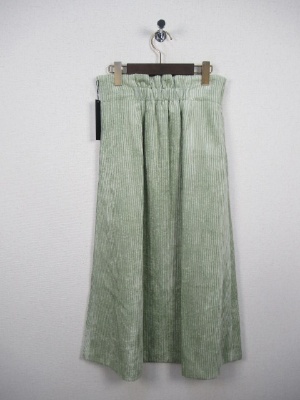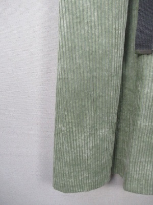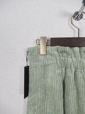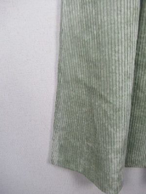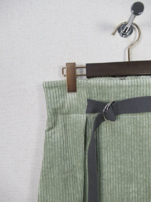 太い畝のコーデュロイ ウエスト後ろゴム入り フロントにタック有り そこにベルトでアクセント 横ファスナー 裏地あり くるぶし上の丈 ややハイウエスト