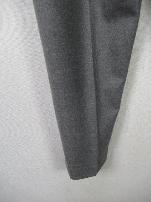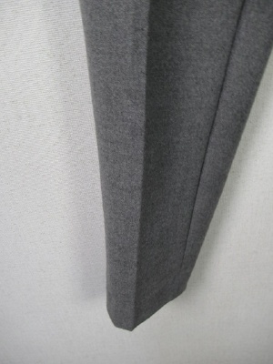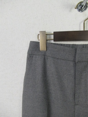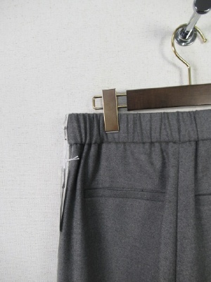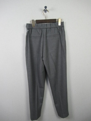 センターライン入りの細みデザイン、ややテーパード、前ホック・ファスナー、ウェスト後ろゴム、脇ポケット、裏地あり