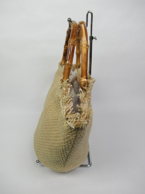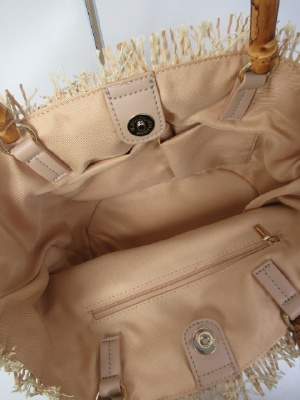 バンブー持ち手、バケツ型、トップはフリンジ、真中中央マグネット留め、内側ポケットあり