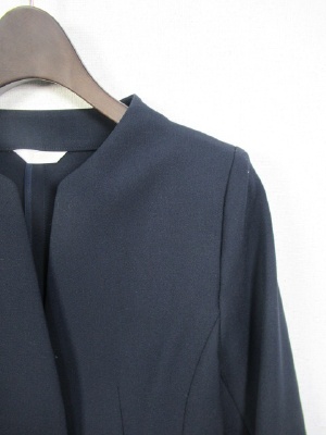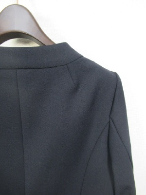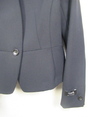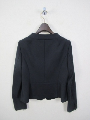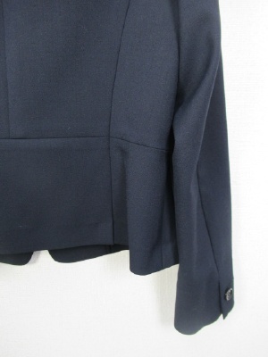 ノーカラーのジャケット、一つボタン、裏なし、袖口は一つボタンで折り返し可能、後ろぺプラム仕上げ、ポケットなし、手洗い可能