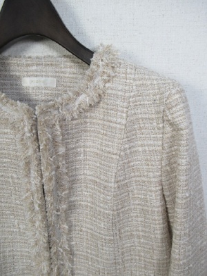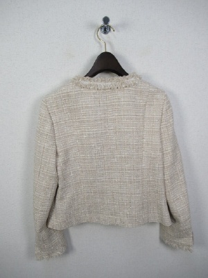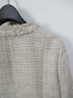 ツィードのシャネルタイプのジャケット、鍵ホック、背抜き、袖はスリットが入り折り返しできます、ポケット付き、前立てと袖口フリンジ