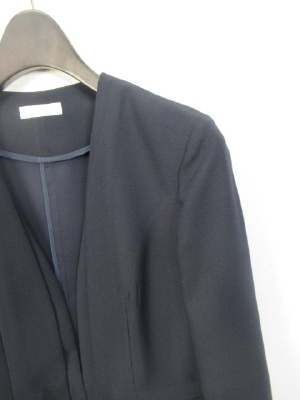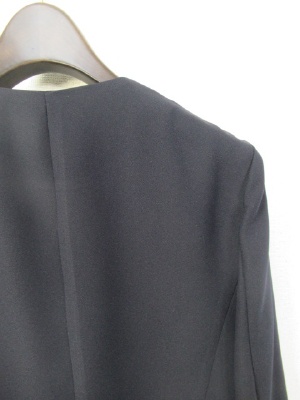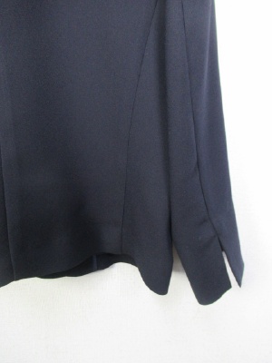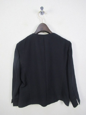 ノーカラージャケット、前立ての部分が二重になったデザイン、鍵ホック、七分袖、袖はスリット入りで折り返し可能、裏なし