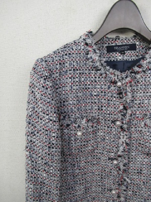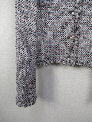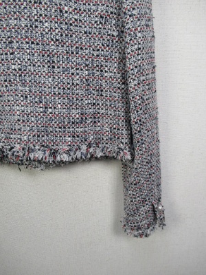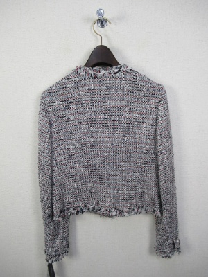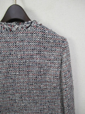 白地に赤・黒・紺をミックスしたツィードのノーカラージャケット、裏地あり、飾りのパールボタン(袖口と前見ごろ)