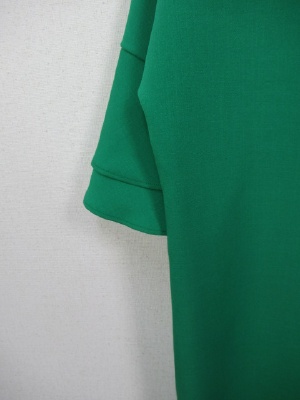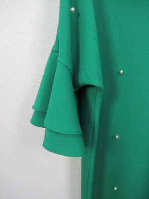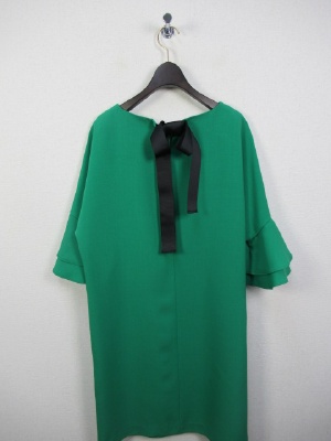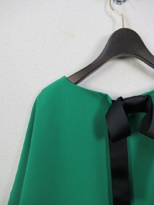 後ろ黒リボン(グログランテープ)ファスナー無しでかぶるタイプ 袖は2段フリル 前みごろにはパールのボタンをちりばめてる 裏付き