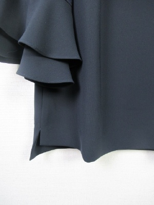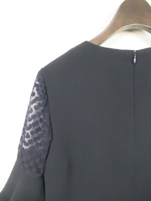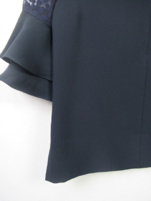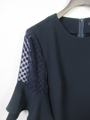 袖は2段のティアードフリル 途中は同系色のドット柄(透け感のあるシフォン地に)後ろファスナー 裾は前後差有り 横スリット