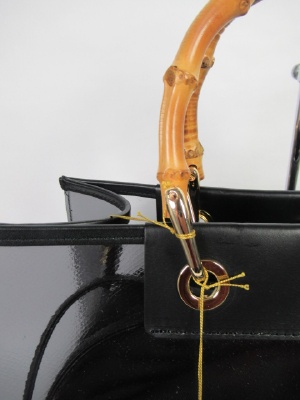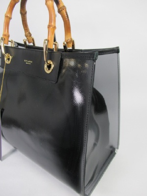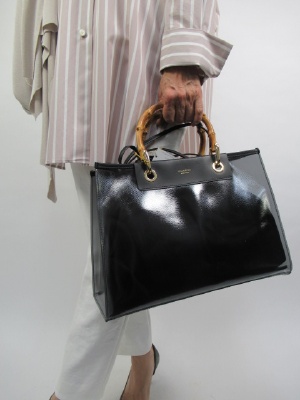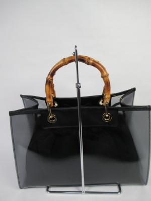 グレーブラックのやや透け感のあるバッグに黒のインナーバッグ(巾着タイプ)付き、バンブー