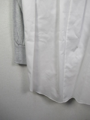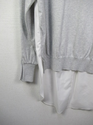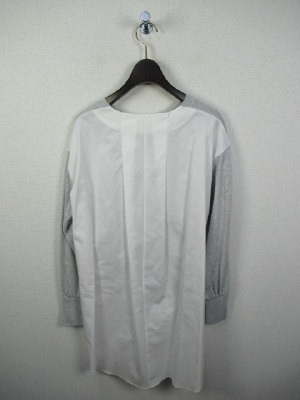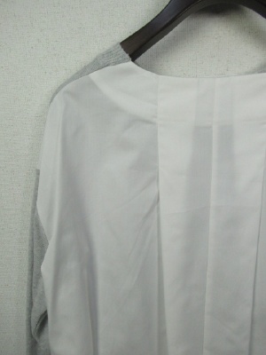 前と後ろで異素材、前身ごろとお袖まではニットで後ろ身ごろははシャツです、前後差広めで後ろはタック入り、脇スリット