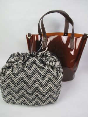 インバッグはゴブラン織りの巾着袋 外は透明な素材のバケツ型 中の巾着は同じ色 ショルダーベルト付き